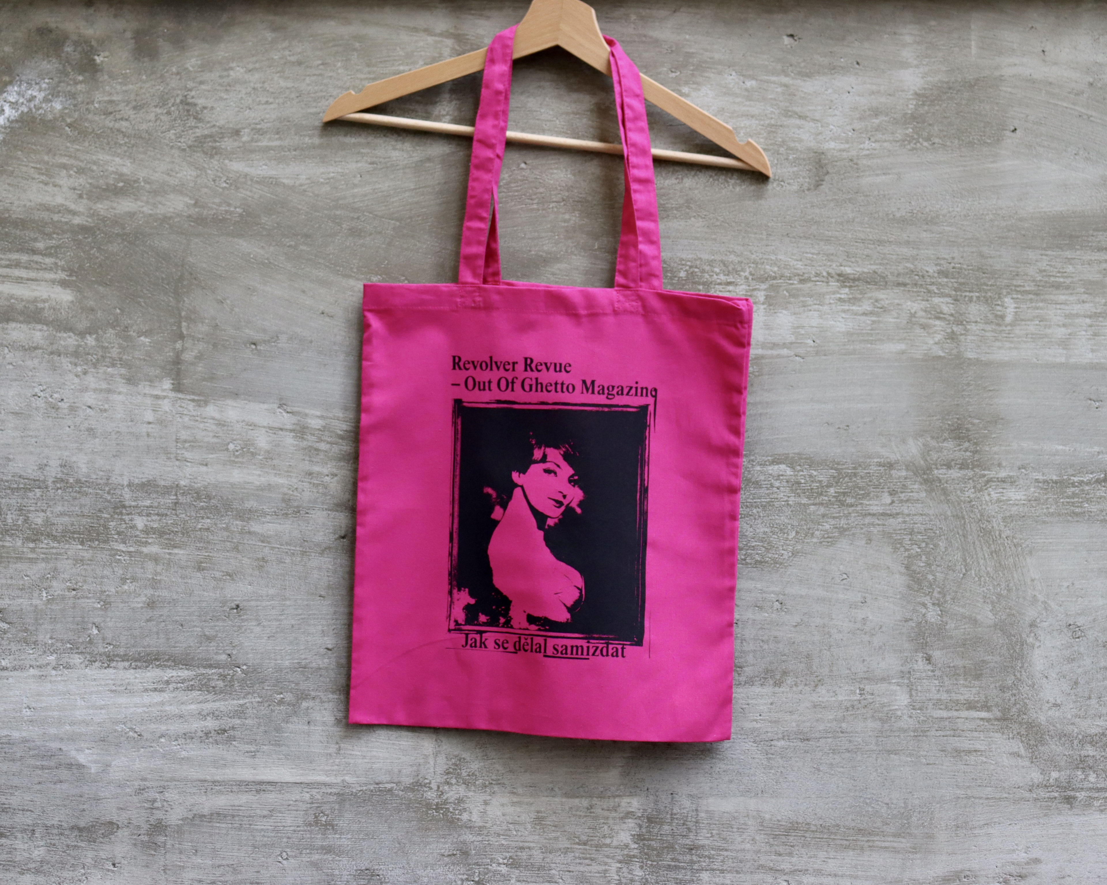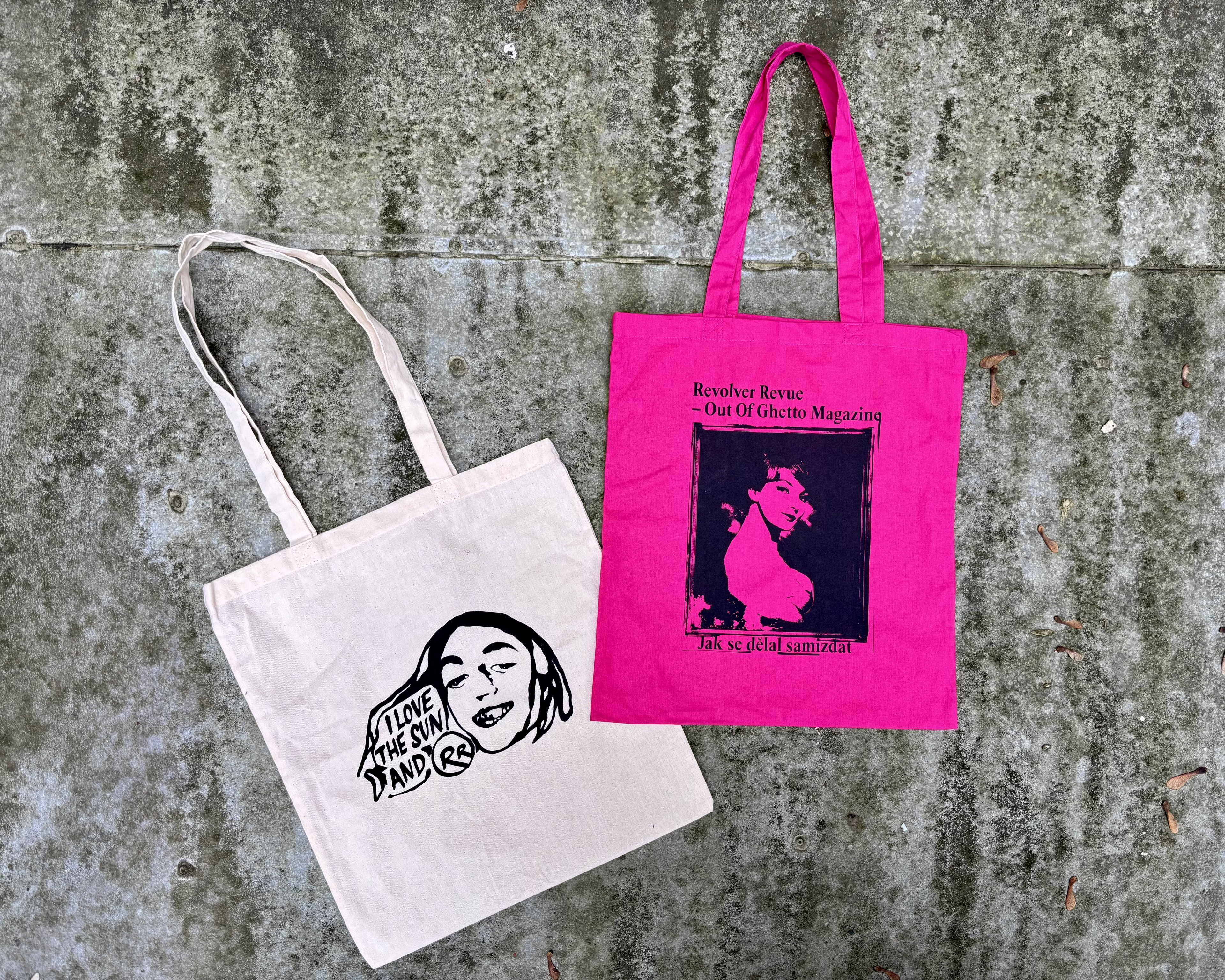 - taška „Out Of Ghetto Magazine“ s Košířskou Madonou (růžová s černým potiskem) a „I love the sun and RR“ (natural s černým potiskem)