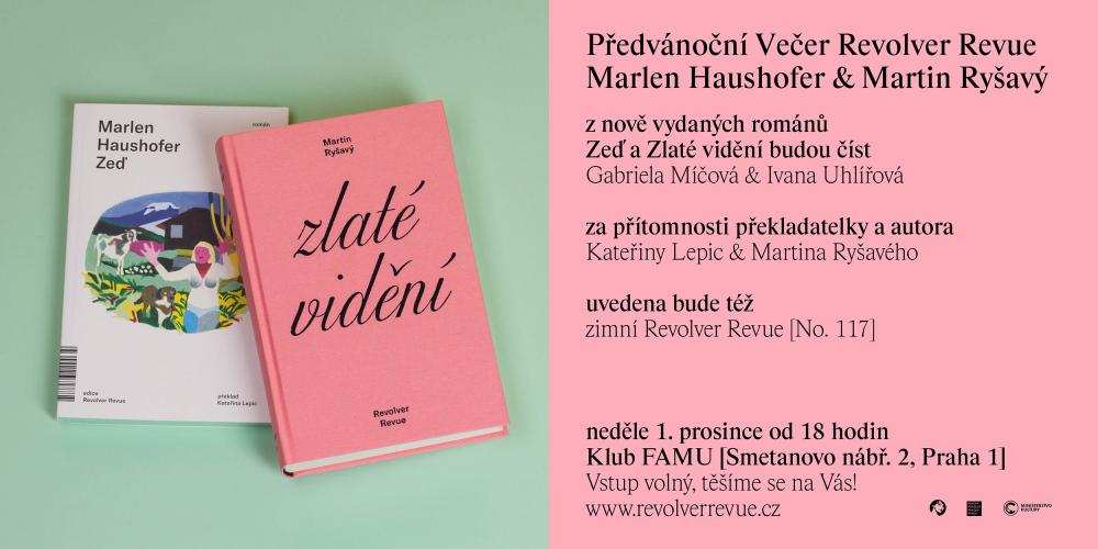 Zveme Vás na předvánoční Večer Revolver Revue, na kterém z nově vydaných románů Marlen Haushofer Zeď a Martina Ryšavého Zlaté vidění budou číst Gabriela Míčová a Ivana Uhlířová za přítomnosti překladatelky Kateřiny Lepic a autora. Uvedena bude též zimní RR.Neděle 1. prosince od 18 hodin, Klub FAMU (Smetanovo nábř. 2, Praha 1). Vstup volný, těšíme se na Vás!